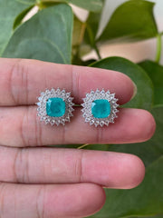Product Details: These exquisite stud earrings showcase vibrant turquoise cushion-cut stones as the stunning focal point, each surrounded by a brilliant sunburst halo of white stones. The radiating pattern creates beautiful light reflection and adds dimensional sparkle that catches the eye. The sophisticated cushion cut provides vintage-inspired elegance with contemporary appeal.