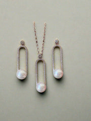 This stunning jewelry set features a contemporary design that perfectly balances modern architecture with timeless elegance. The set includes a matching pendant necklace and earrings, each showcasing: