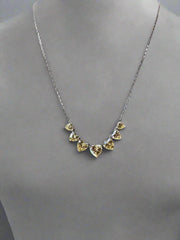 This charming necklace features a delicate arrangement of heart-shaped citrine yellow crystals that create a romantic and feminine focal point. The warm golden-yellow stones are beautifully graduated in size and elegantly suspended from a fine silver-tone chain, perfect for adding a touch of sunshine to any ensemble.