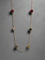 Embrace sophisticated style with this versatile station necklace featuring a stunning combination of ruby red and smoky grey crystals. Each stone is perfectly spaced along a delicate gold-tone chain, creating a harmonious blend of rich and neutral tones.