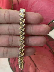 This exquisite tennis bracelet showcases a continuous line of meticulously set baguette-cut stones in a gold-tone setting. Each stone is positioned to maximize brilliance and light reflection, creating a stunning effect as it moves with the wearer.