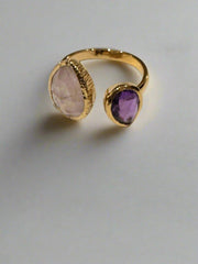 An elegant open ring featuring the ethereal combination of rose quartz and amethyst, creating a perfect balance between soft pink and royal purple hues. Handcrafted in our Parisian atelier, this adjustable piece embodies both delicacy and boldness.